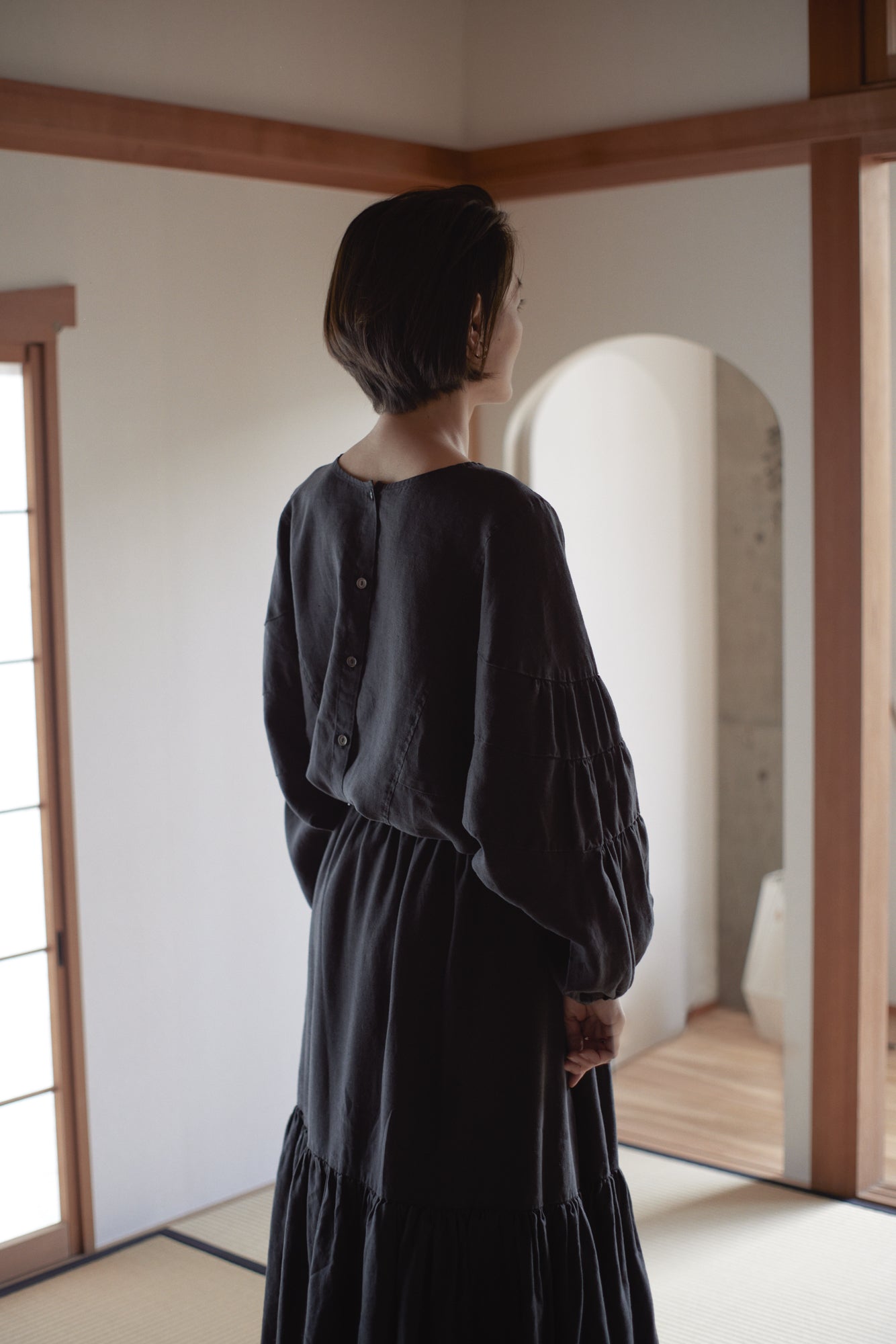 The new-age hemp material creates a soft and beautiful silhouette for the sleeves. The drape around the hem is very elegant. It also has a 2-way design that can be worn either front or back.
