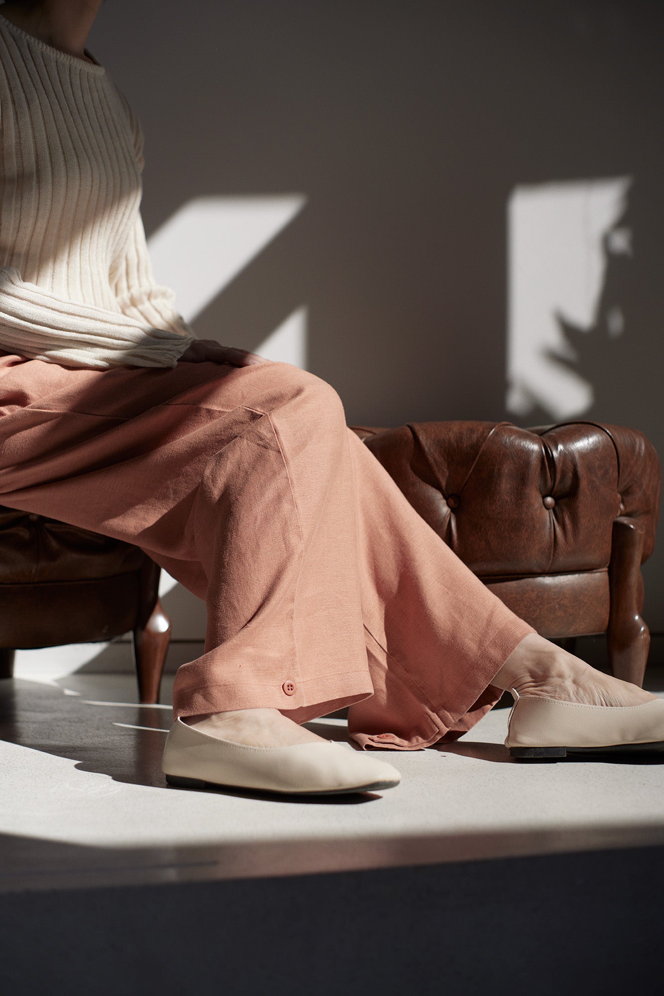 These pants and knitwear are easy to wear, but the texture of the material gives them a beautiful silhouette. They have a drape and shine, and are casual yet elegant. They are perfect for work or going out.