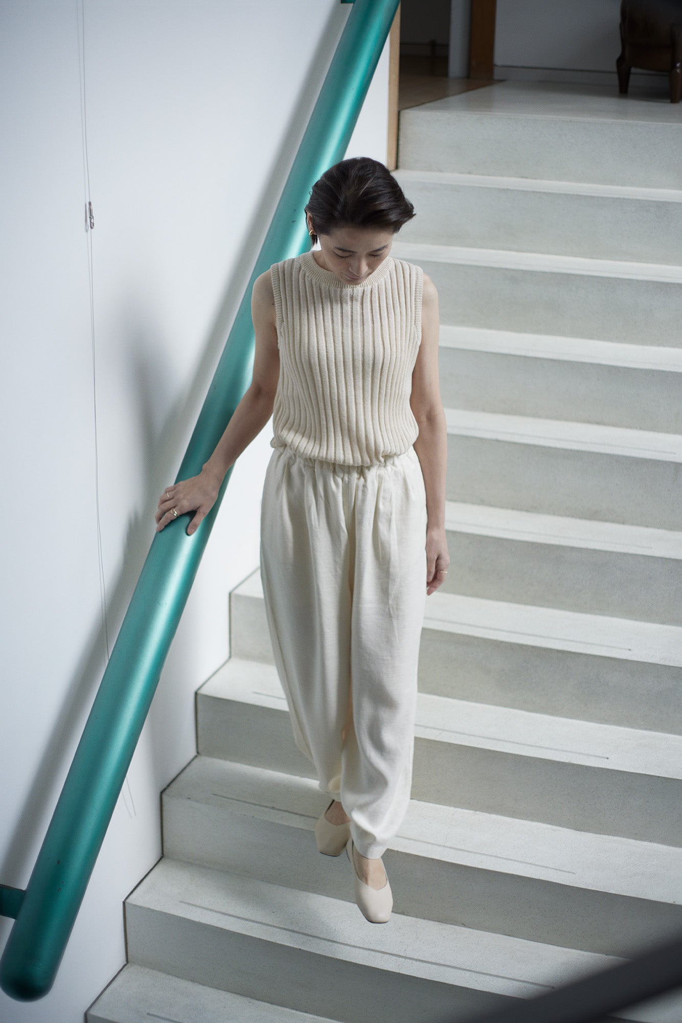 The fluffy knit is three-dimensional and soft. It creates a gentle silhouette with the new-generation hemp material that has a gentle drape.