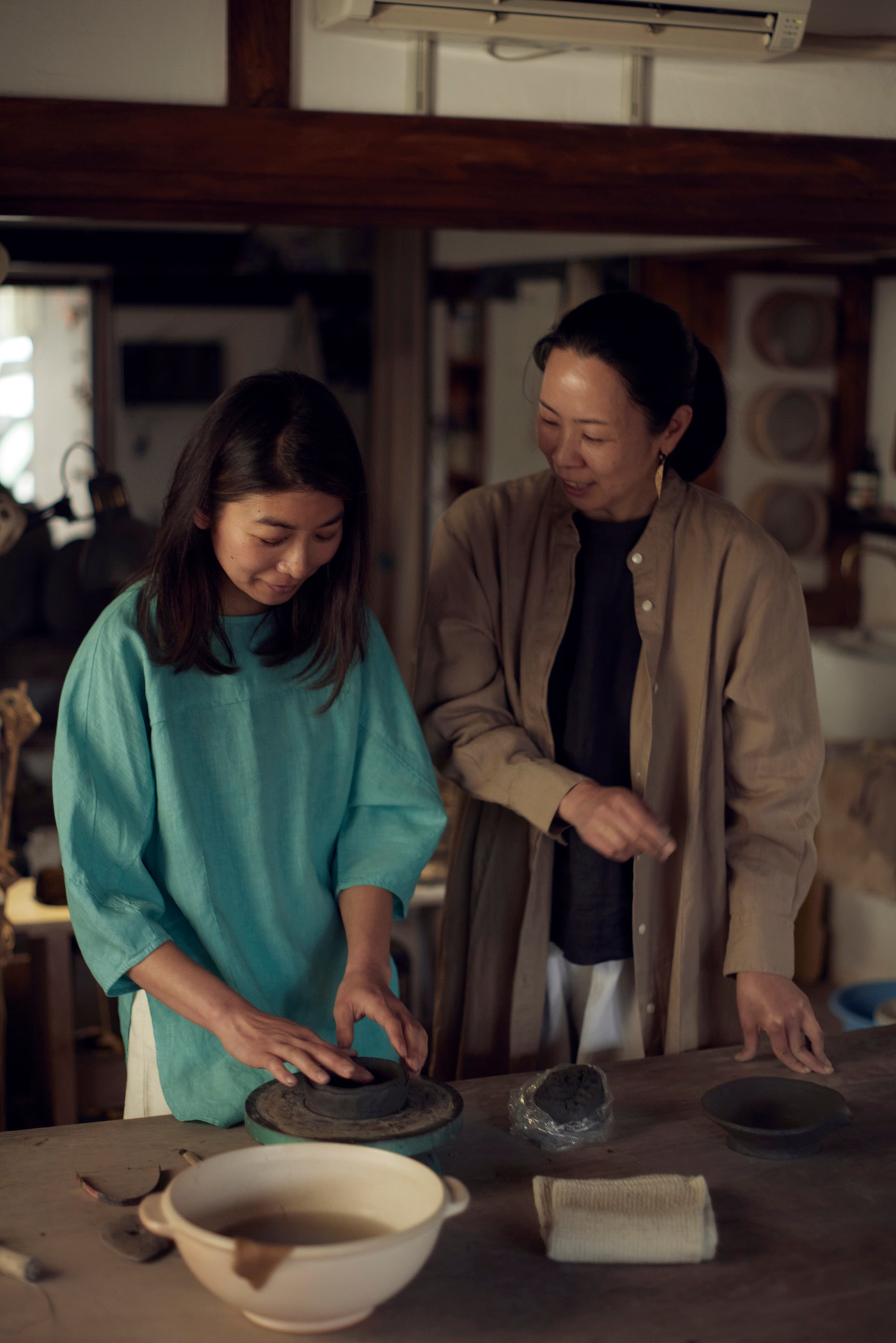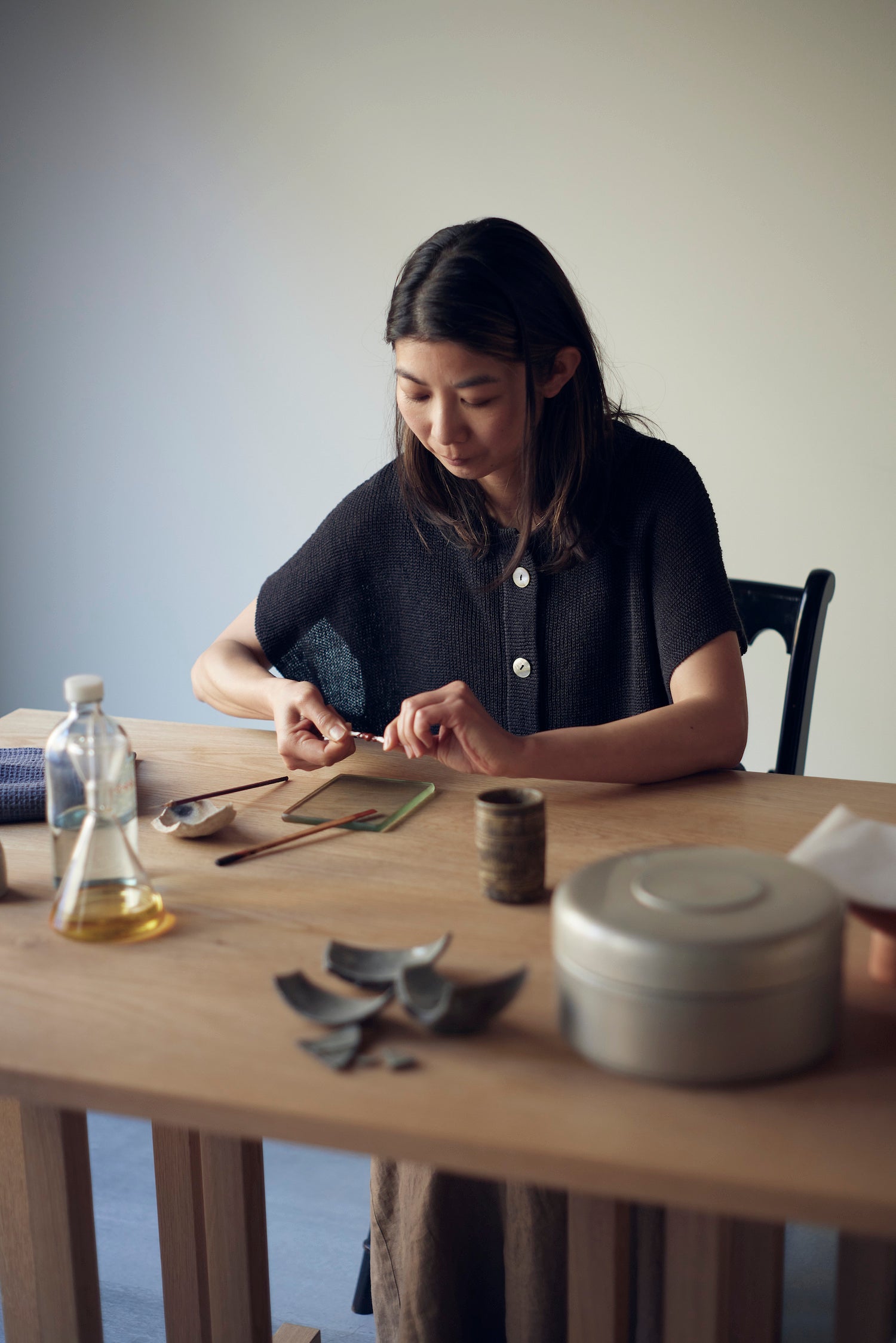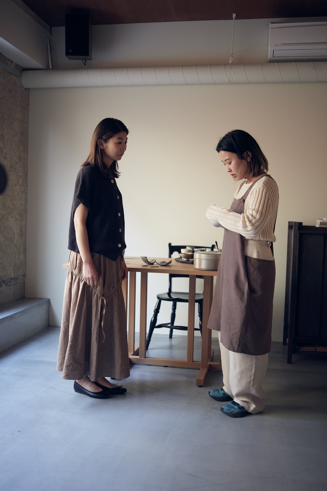 金継のお教室。リラックスできる柔らかなコクーンシルエットのヘンプニットに、Liloopのギャザースカートでアクセントを。先生は、ふわふわリブのヘンプニットとAdvanced Hempツイルのパンツに丈夫なヘンプエプロン。優しい肌触りと美しい光沢に包まれる穏やかな時間を紡ぎます。