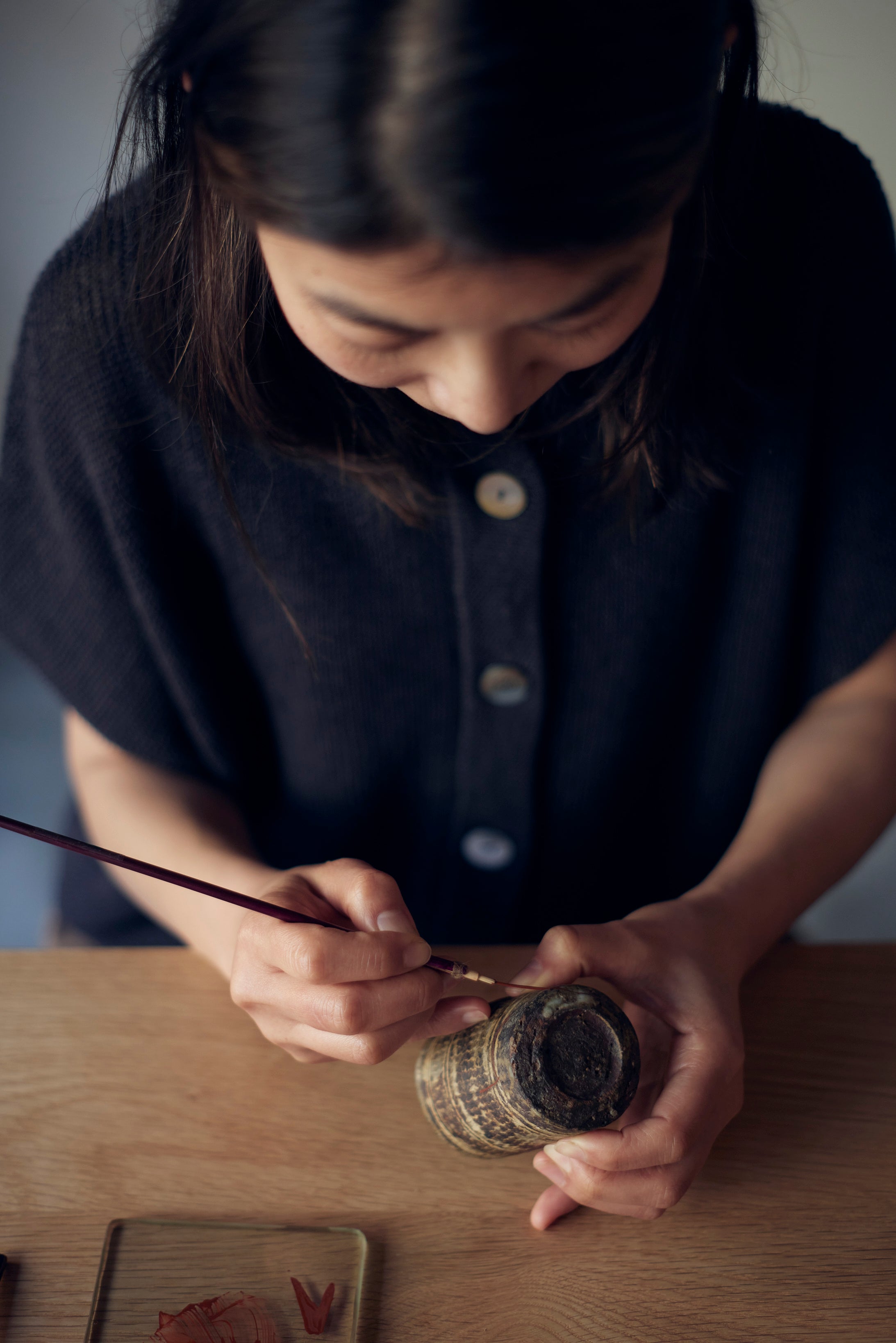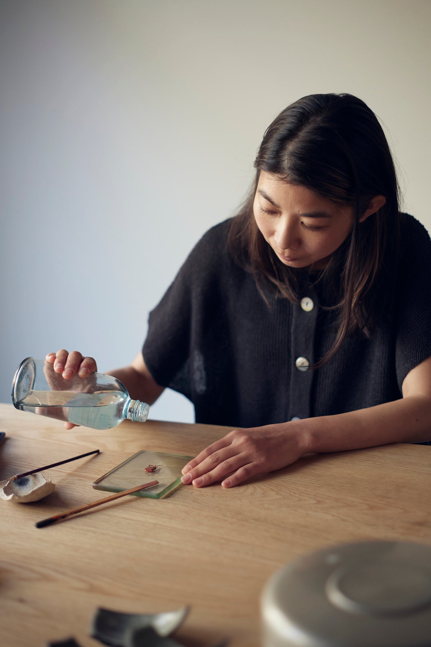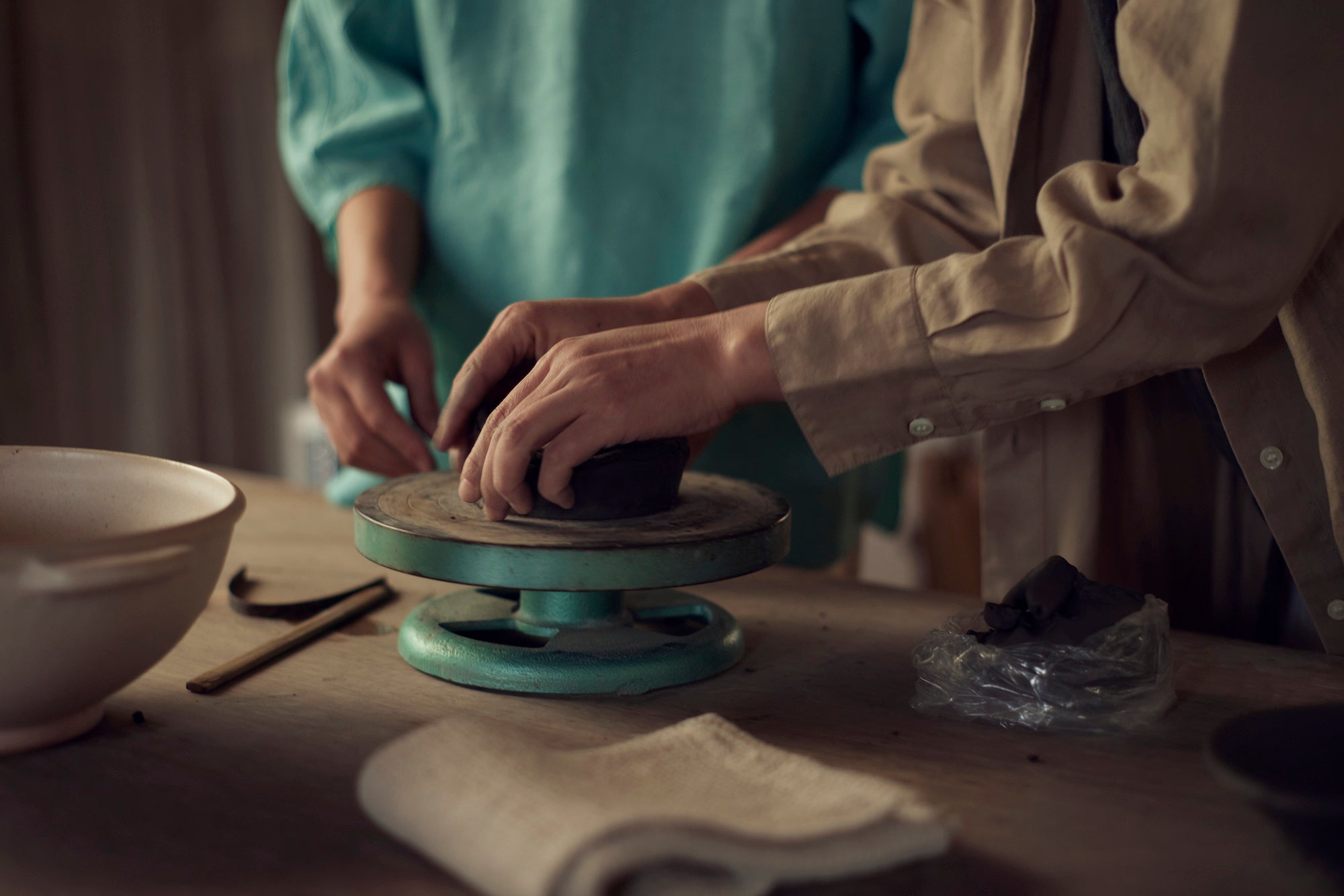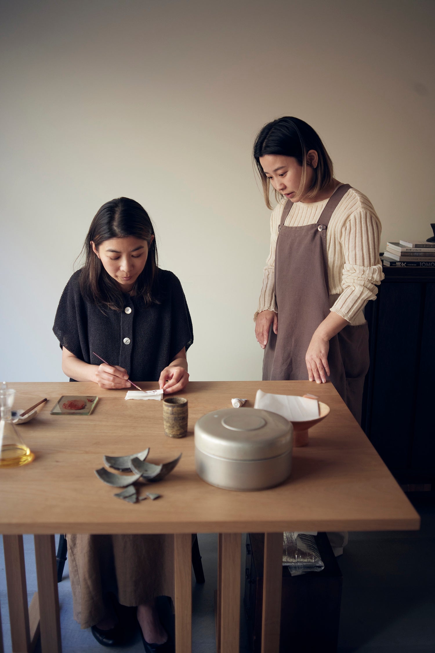 金継のお教室。リラックスできる柔らかなコクーンシルエットのヘンプニットに、Liloopのギャザースカートでアクセントを。先生は、ふわふわリブのヘンプニットとAdvanced Hempツイルのパンツに丈夫なヘンプエプロン。優しい肌触りと美しい光沢に包まれる穏やかな時間を紡ぎます。