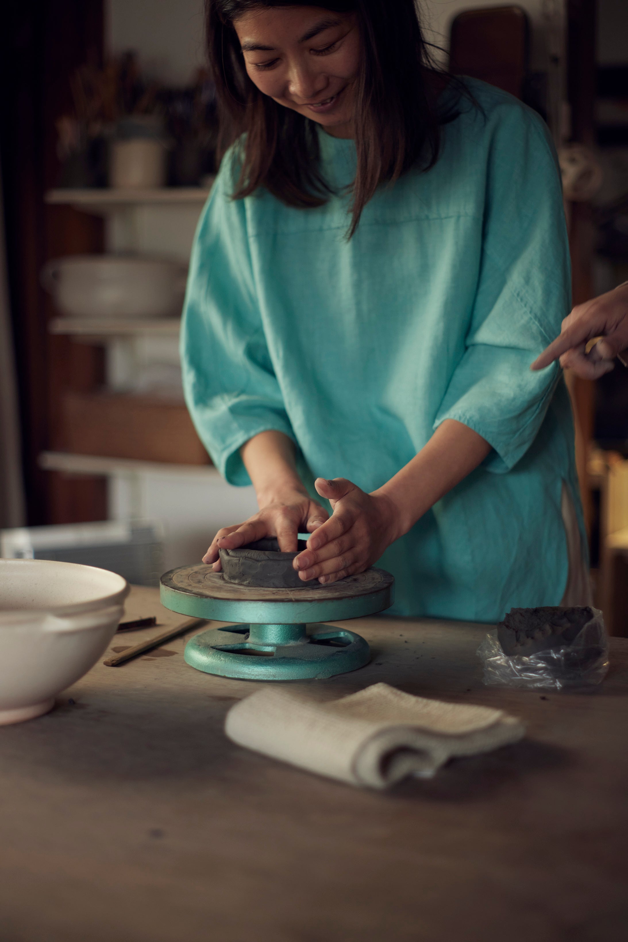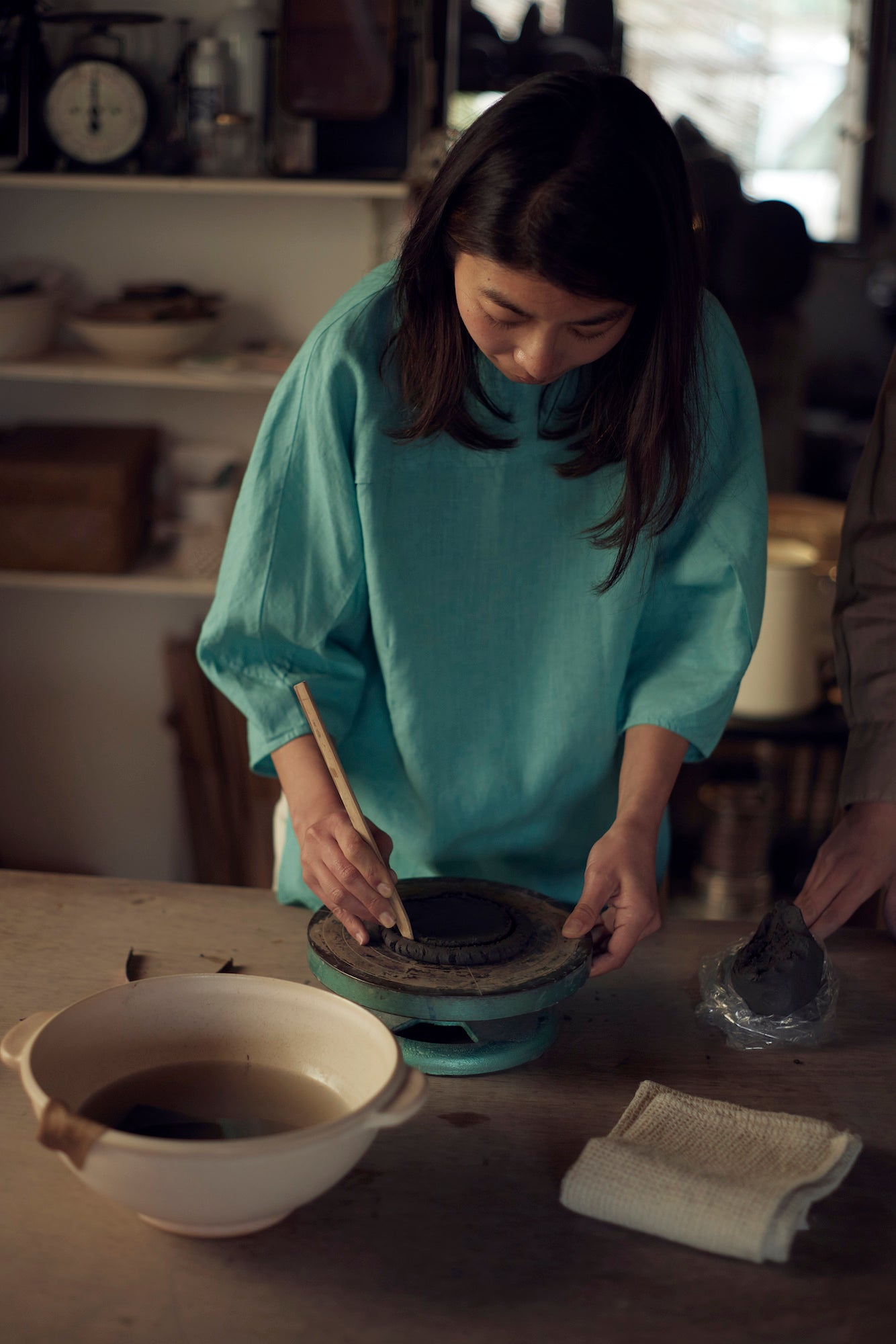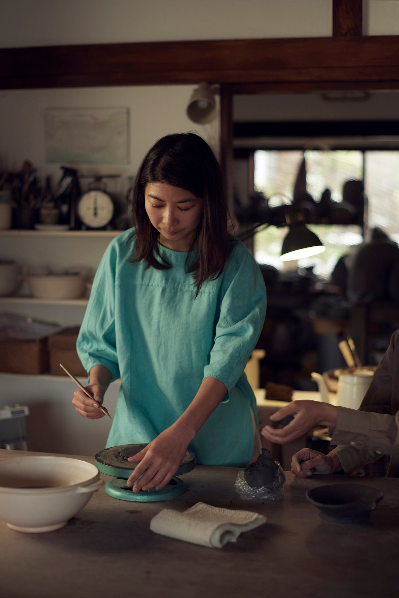 土に向かい素の自分に戻る時間。さらに進化したヘンプ素材Advanced Hempのフェザーブラウス。しなやかで軽く柔らかな素材から生み出される、極上の肌触り。陶芸の先生がまとう凛とした光沢のあるヘンプワンピース。自然環境を再生する素材の心地良さに囲まれて、日々の暮らしに格別なケアを。