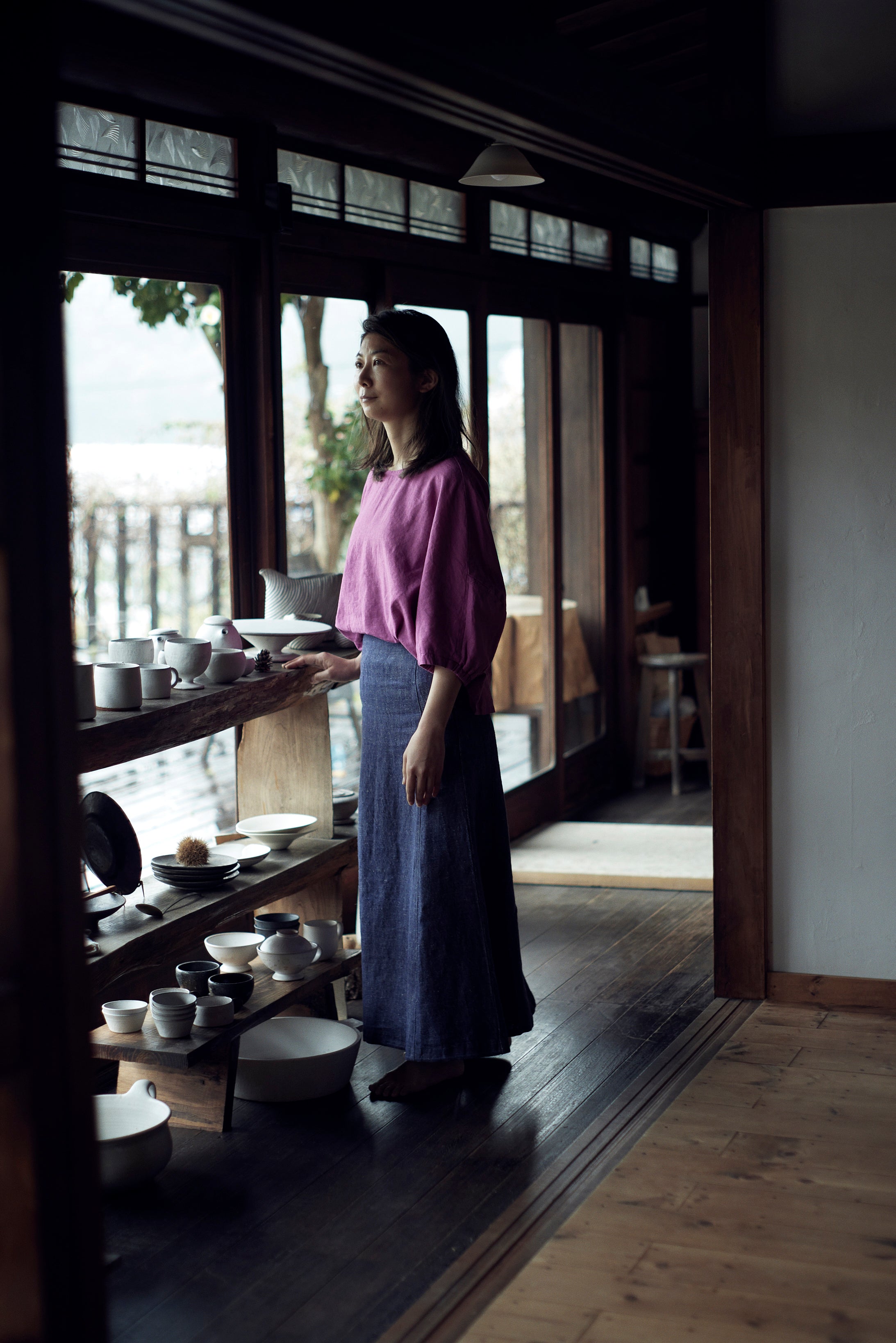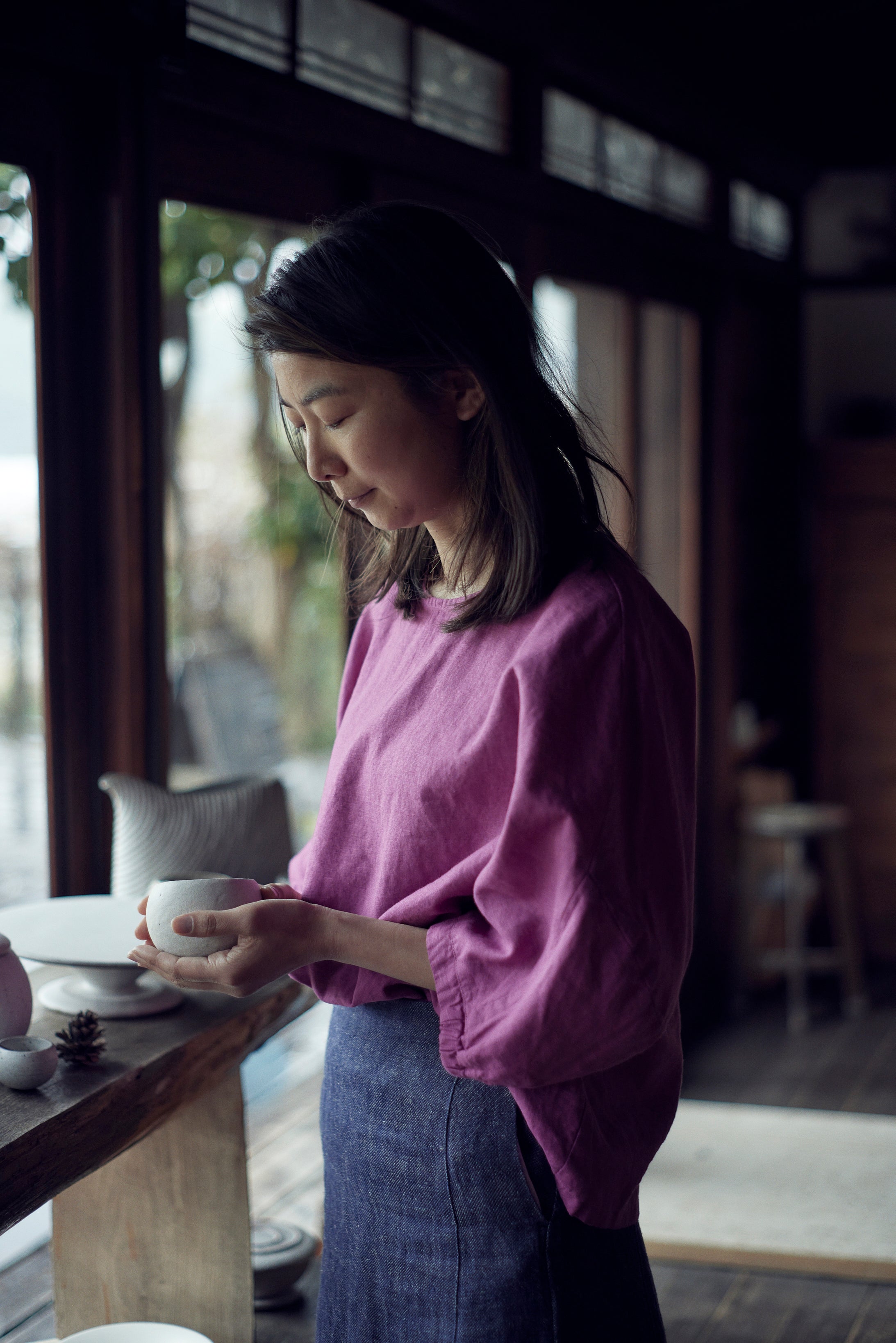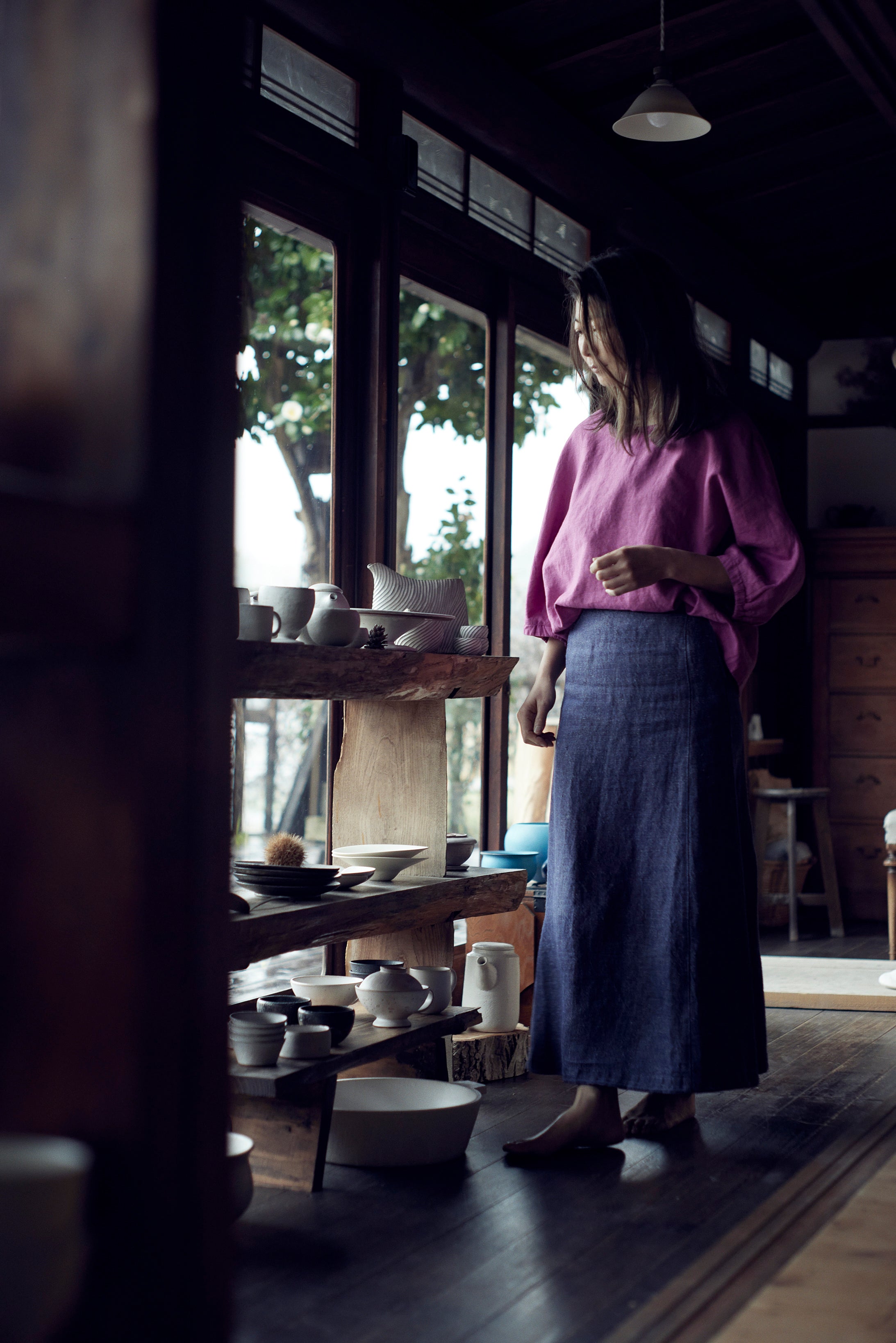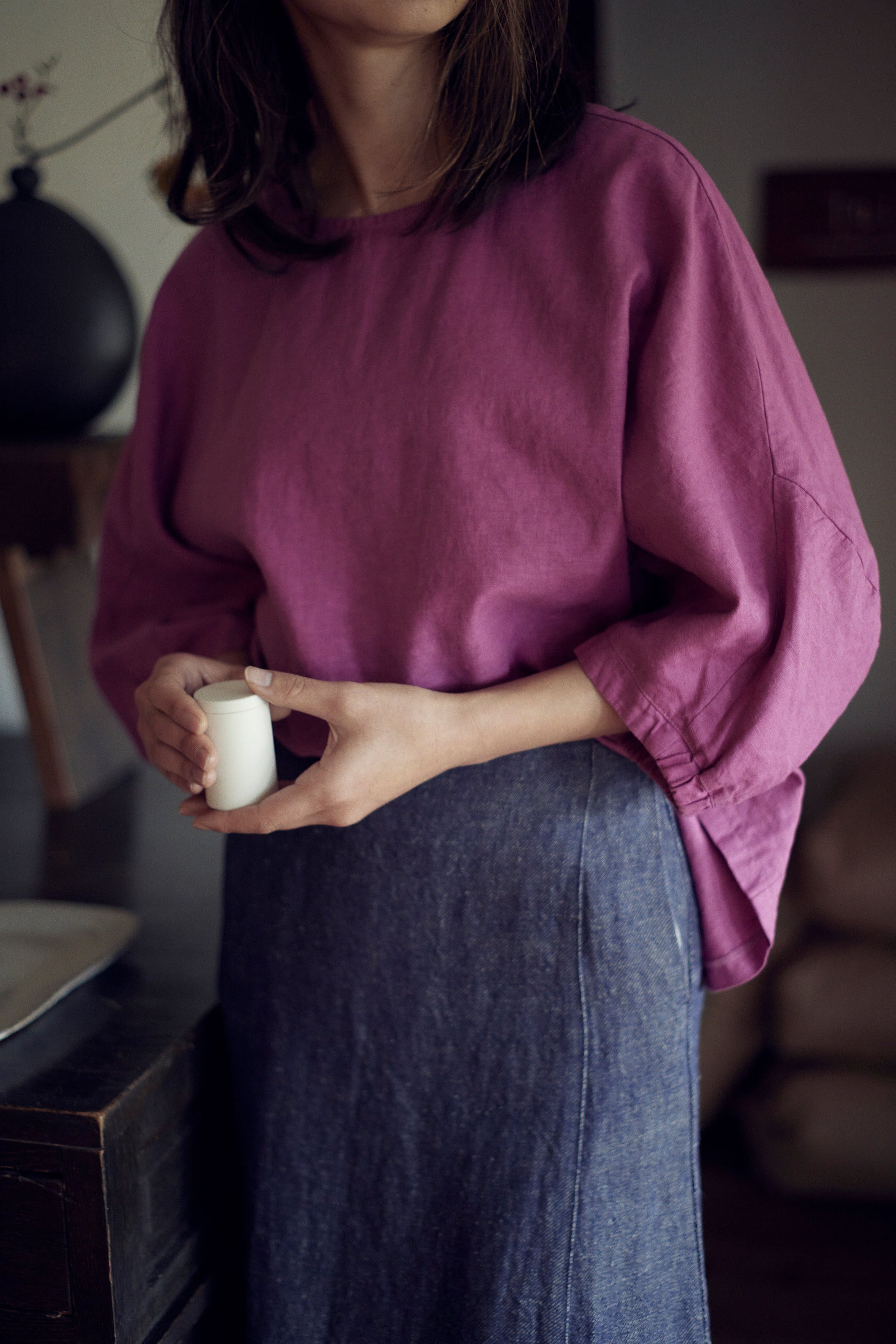 陶器に宿る心に触れる。「Liloop」素材のブラウスから湧き上がる柔らかな空気感。お袖のドレープの優しさ。ヘンプ素材のデニムスカートに合わせて放たれる、シルエットのしなやかな美しさを感じながら。